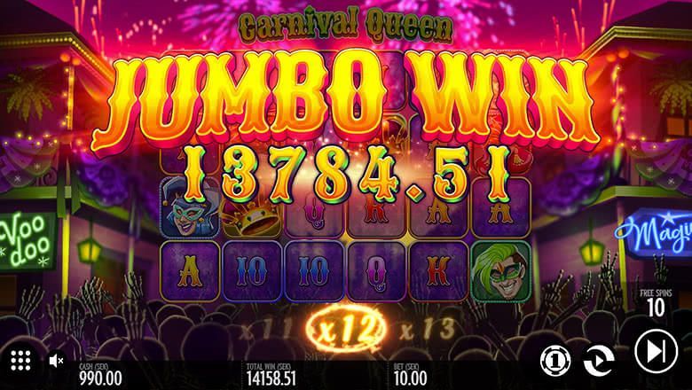 Maximum win for Carnival Queen is 22,700x your total bet. At the highest bet level, the max win is £68,100.